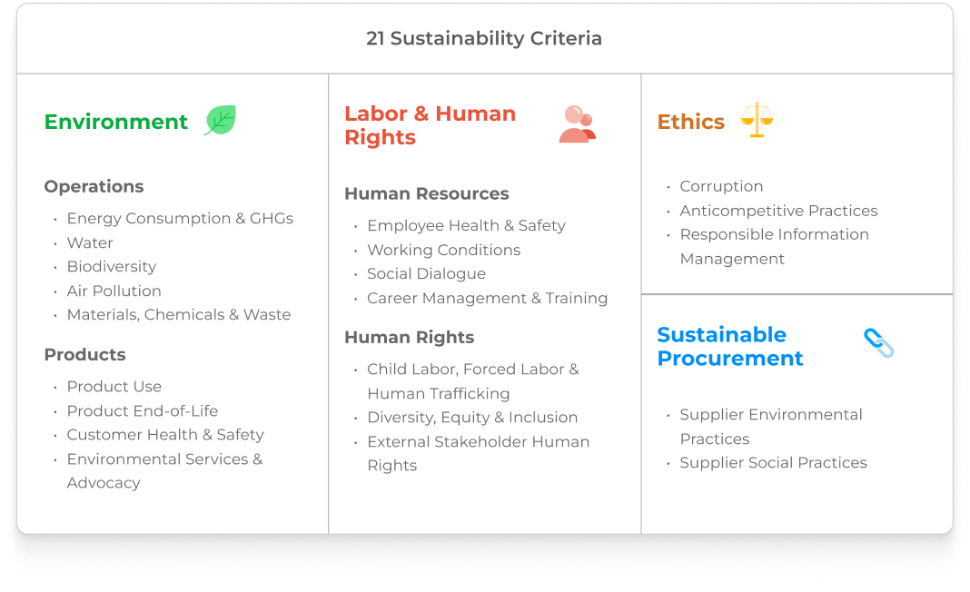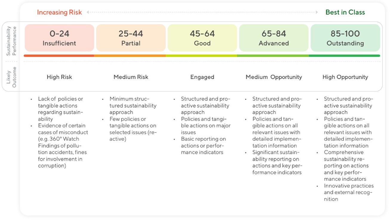 The EcoVadis scoring system ranges from 0 to 100 and yields a public rating and a metallic badge (bronze, silver, gold).