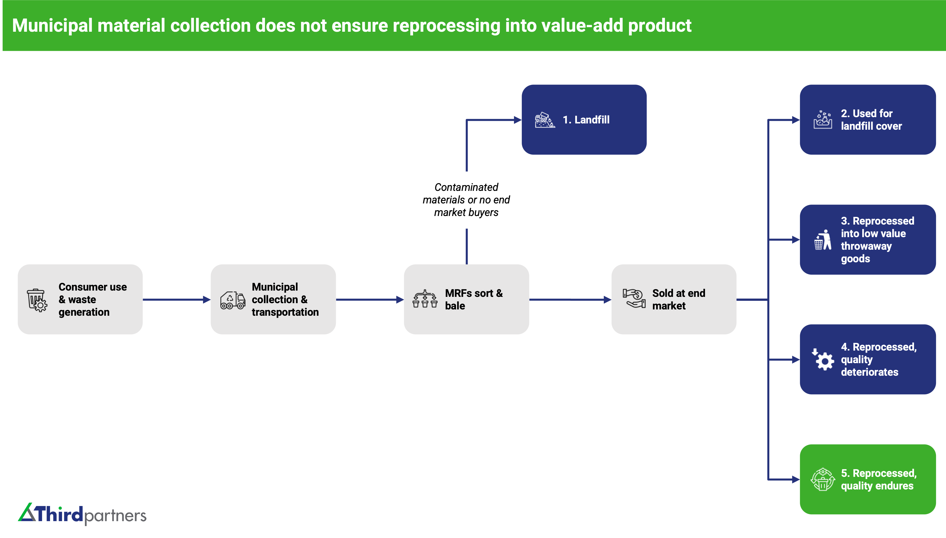 The dark blue boxes in the diagram above illustrate the range of scenarios where materials that are technically considered “recyclable” will ultimately just be landfilled or downcycled into lower value goods.
