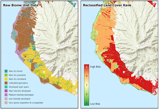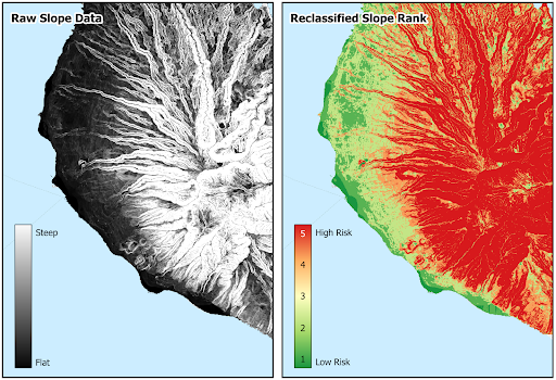 Wildfire risk analysis: Variables including slope, soil type, precipitation, and vegetation are indicators of wildfire risk. GIS is a useful tool for pulling in all of these variables and developing a risk model. Below are some examples of raster maps of risk layers in Lahaina, Hawaii.